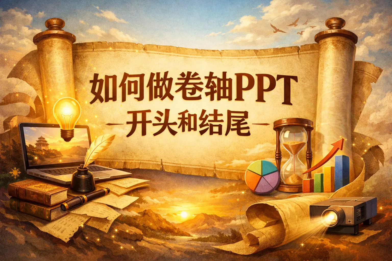 卷轴式 PPT 开头和结尾的本质,是通过“展开—收束”的视觉与节奏设计,帮助观众更自然地进入主题并加深最终记忆。只要明确适用场景,选择合适的设计思路,并在 PowerPoint 中合理运用遮罩、动画窗格和节奏控制,就能在不增加过高制作成本的前提下显著提升演示的专业度与叙事感。未来卷轴 PPT 将更加轻量化、内容驱动,重在服务信息表达而非单纯炫技。