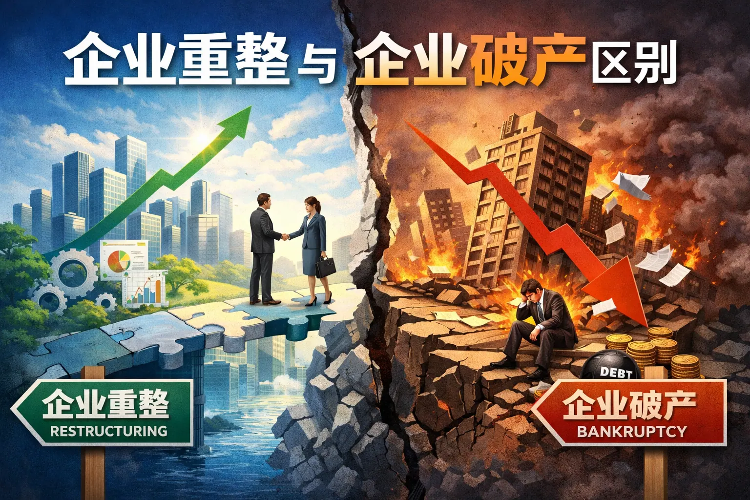 企业重整与企业破产虽同属破产法框架,但本质目标不同:重整以恢复企业持续经营能力为核心,通过债务重组和结构调整实现“重生”;破产清算则以依法退出市场、变现资产清偿债务为终点。两者在法律定位、程序流程、债权受偿方式、股东权益、社会影响等方面均存在显著差异。企业应根据是否具备持续经营价值与重整可行性,理性选择适用路径。合理运用重整制度,有助于提升资源配置效率并降低社会成本。
