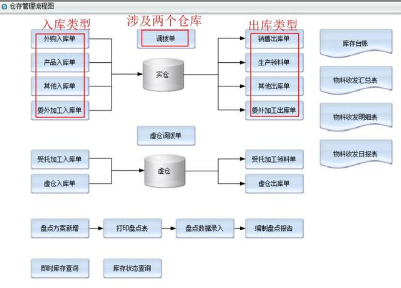 仓存管理系统:是通过入库业务(包括外购入库、产品入库、委外加工入库、其它入库)、出库业务(包括销售出库、生产领料、委外加工出库、其它出库、受托加工领料)、仓存调拨、库存调整(包括盘盈入库、盘亏毁损)、虚仓单据(包括虚仓入库、虚仓出库、虚仓调拨、受托加工产品入库)等功能,结合批次管理、物料对应、库存盘点、质检管理、即时库存管理等功能综合运用的管理系统,对仓存业务的物流和成本管理全过程进行有效控制和跟踪,实现完善的企业仓储信息管理。