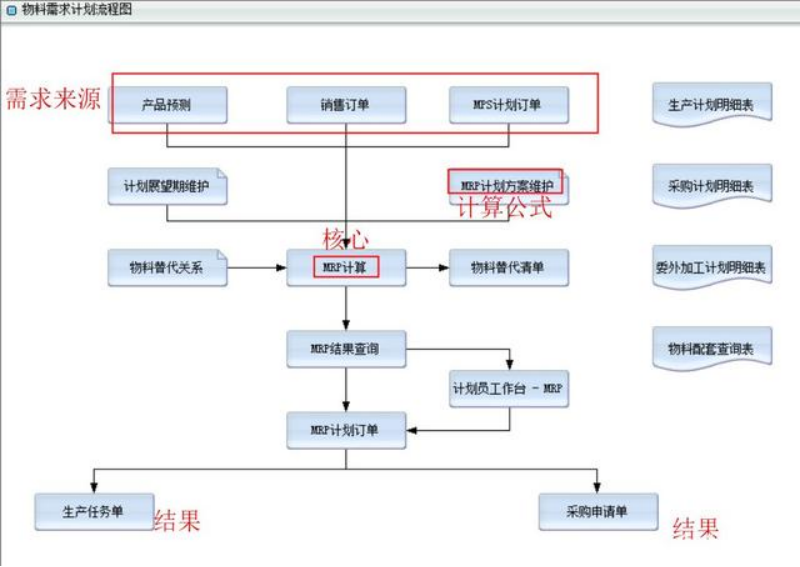 物料需求计划管理系统:通过物料需求计划MRP(Material Requirements Planning),将独立的需求(销售或预测)作为需求,考虑现有库存、已分配量、预计入库等因素,通过BOM向下展开需求,得到主要产品(MRP类物料)的计划量。主计划员可以对该计划量进行维护、确认或进行细能力计划,将能力的影响体现在计划的改变上。对确定的计划订单,也可作为预计入库量,实现滚动计划功能。